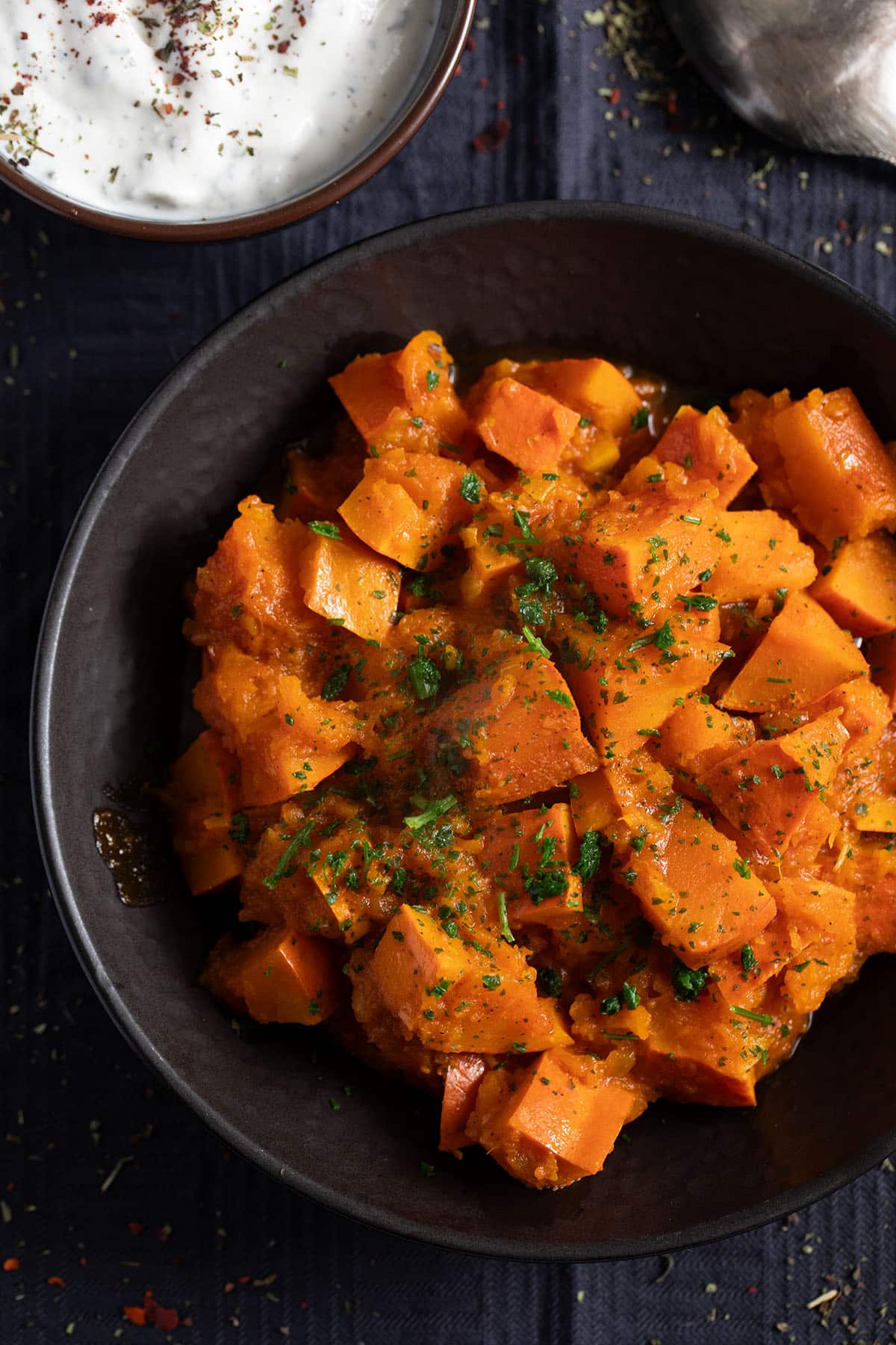 Quick and flavorful braised pumpkin - a spicy stewed pumpkin recipe with ginger, garlic, and turmeric, served with a refreshing mint yogurt dip.