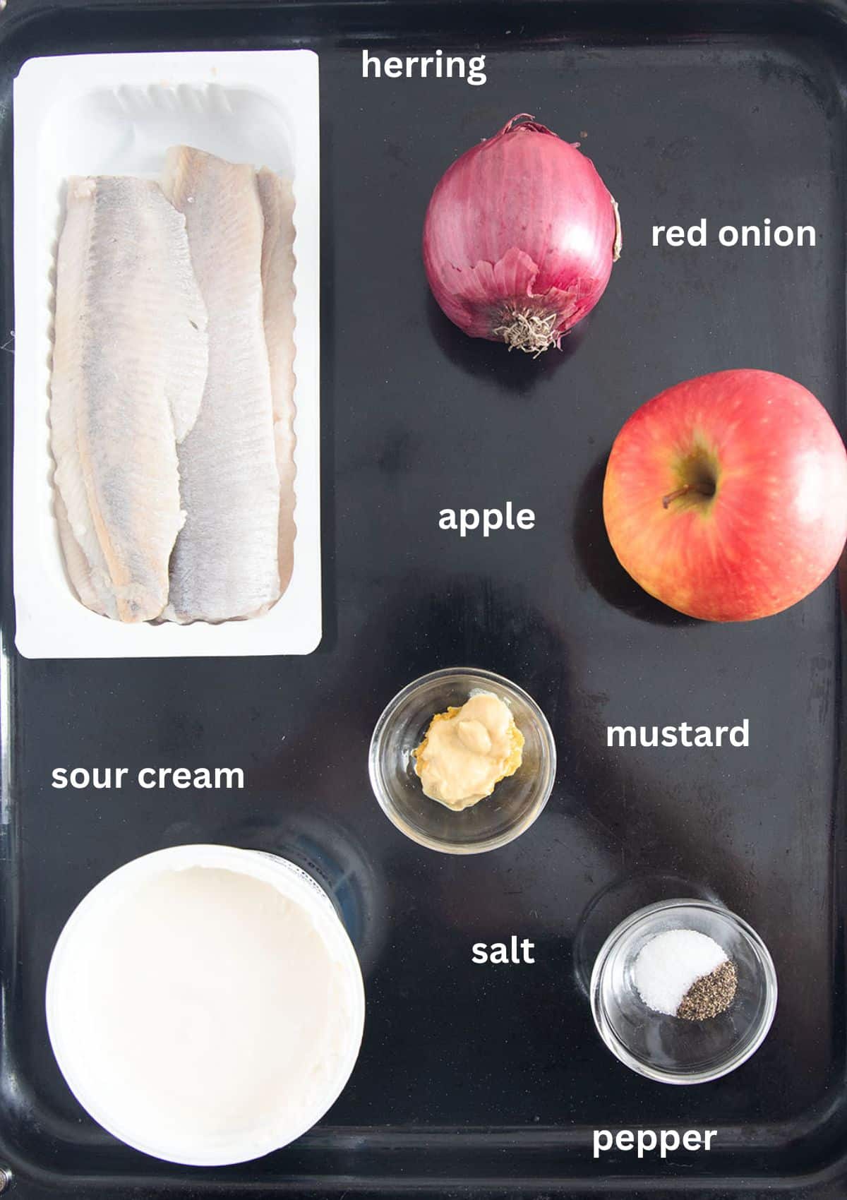 Step #3: Place the herring, onions, and apples in a bowl. Add sour cream, mustard, salt, and pepper.