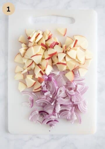 Step #1: Halve the onion and slice it thinly. Quarter and core the apple and slice it thinly too.