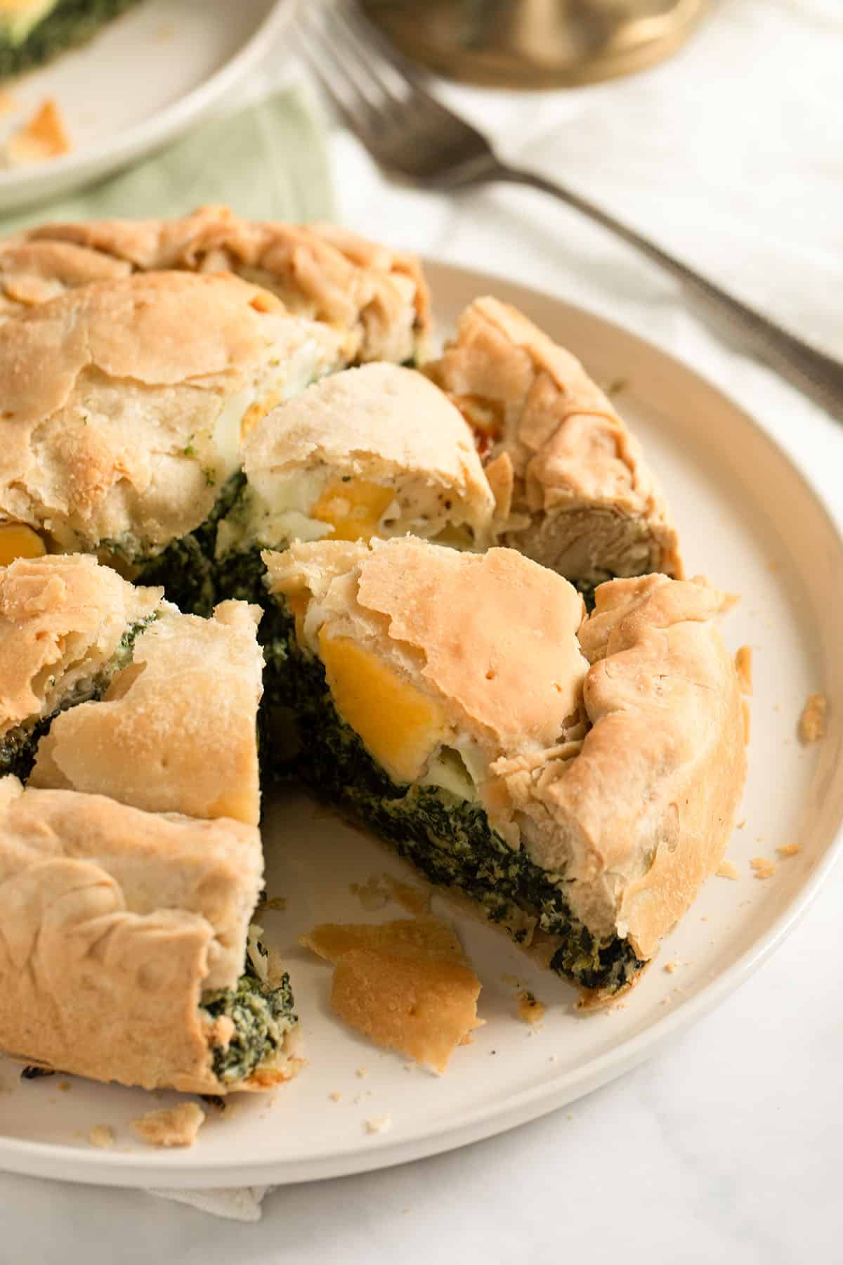 Italian spinach pie is a traditional Easter dish known as torta Pasqualina. It is made with layers of dough and a spinach filling with eggs baked inside.