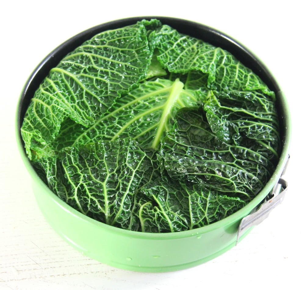 • Line the springform with most of the savoy cabbage leaves, making sure that some of them hang over the edge of the form so that you can cover the rice with them later. I leave one leaf to finish the cake, just in case there are still gaps after covering the rice.