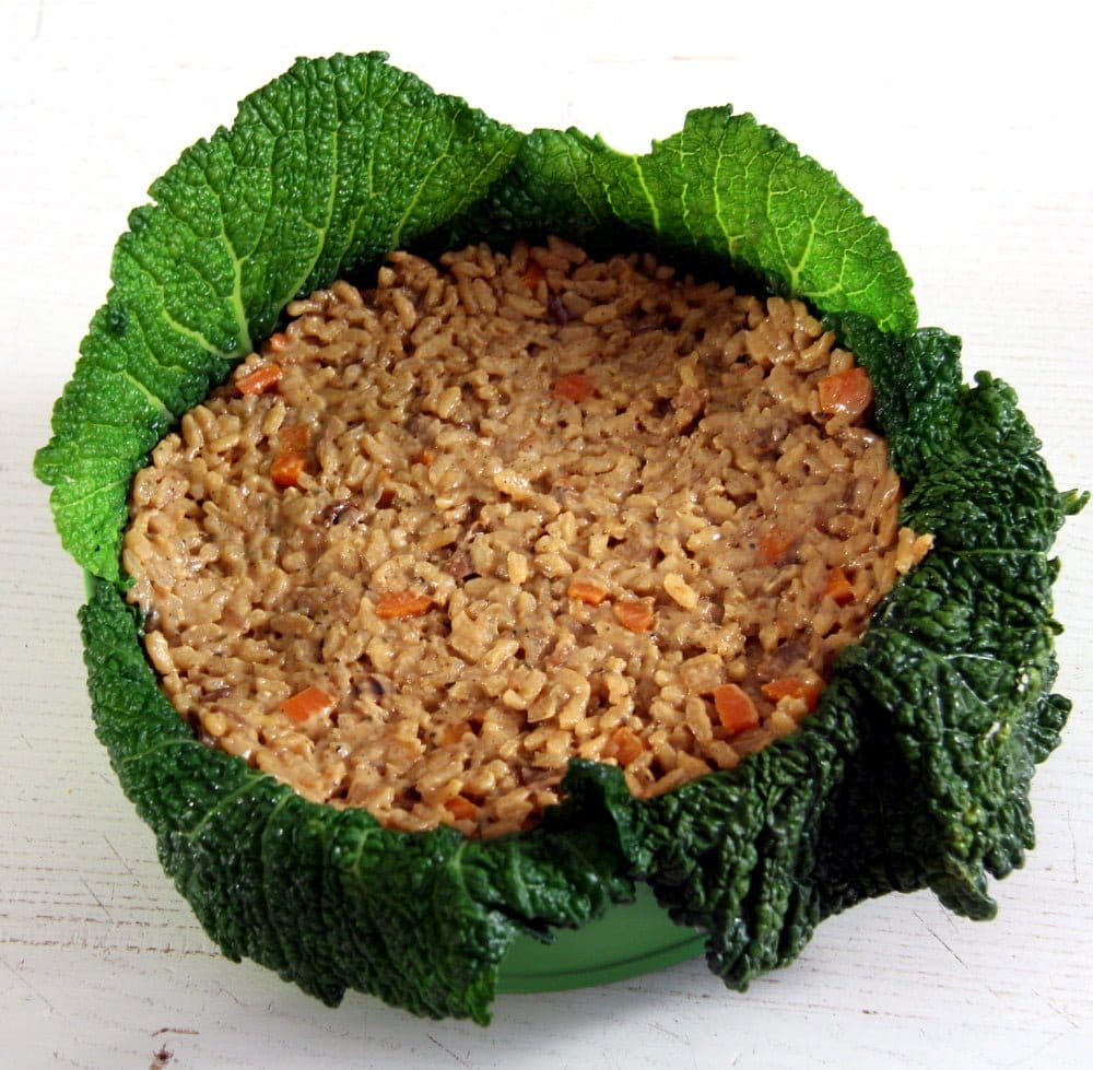 • Line a small springform (about 20 cm/ 8 inches) with the savoy cabbage leaves, leaving one extra to cover the top, if necessary. The leaves should hang over the edge of the form so that you can cover the rice with them later.
